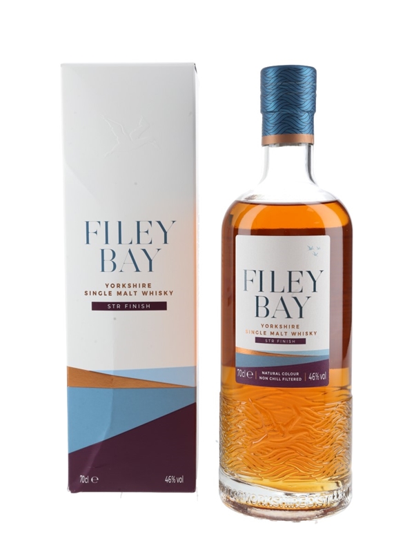 A bottle of Filey Bay Yorkshire Single Malt Whisky. This was matured in ex Bourbon casks, finished in shaved, toasted and re-charred red wine casks and bottled at 46% ABV.