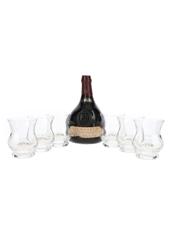 A bottle of Bowmore Islay Single Malt Scotch Whisky, matured in sherry casks and bottled at 43% ABV in 1979 to celebrate the distillery's Bicentenary. This comes with a set of Bowmore branded glasses.
