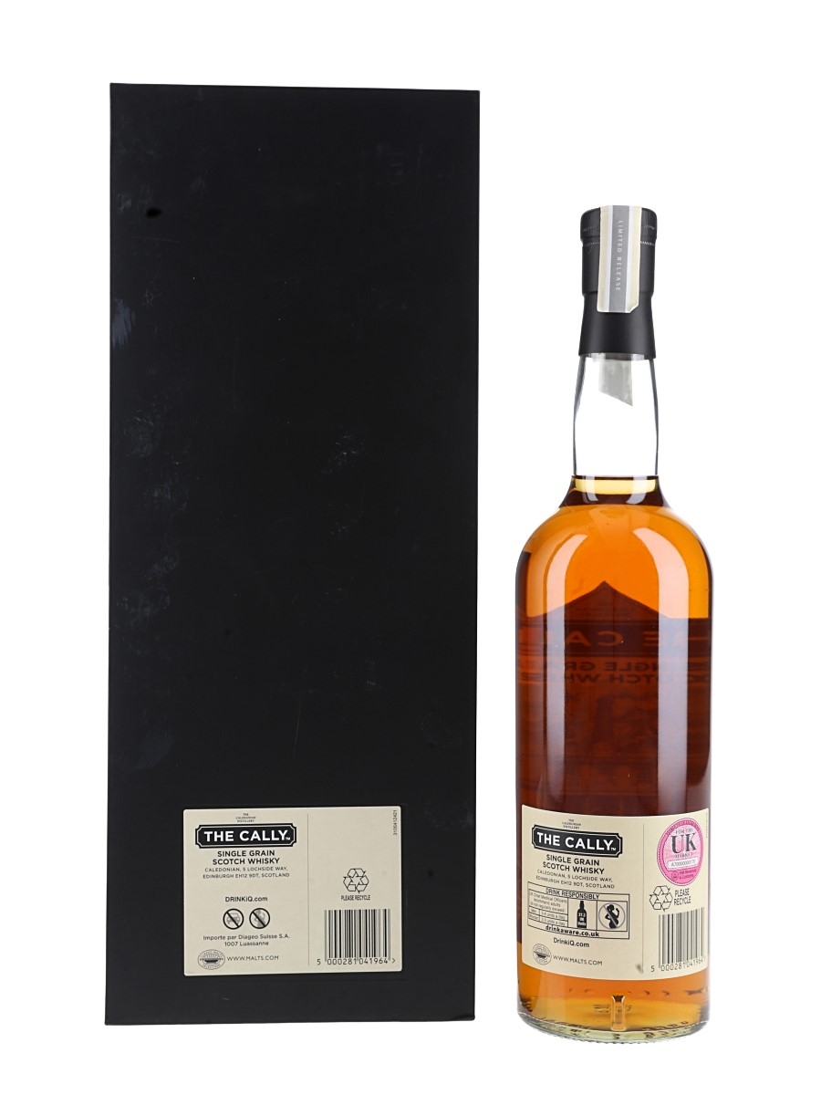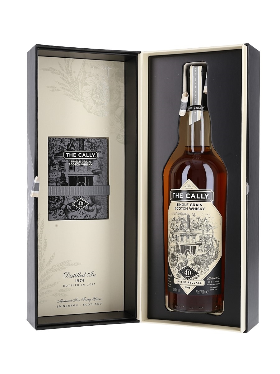 A bottle of The Cally 40 Year Old Single Grain Scotch Whisky. This was distilled in 1974 at The Caledonian Distillery and bottled at a cask strength of 53.3% ABV in 2015.
