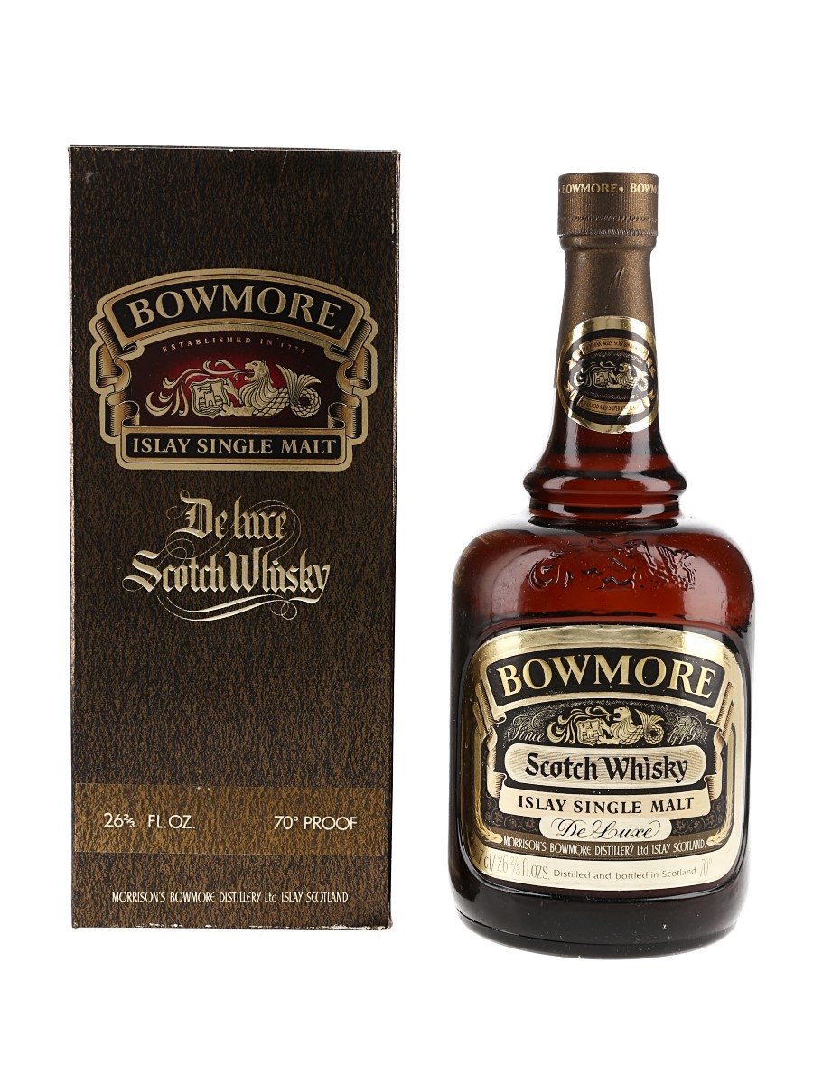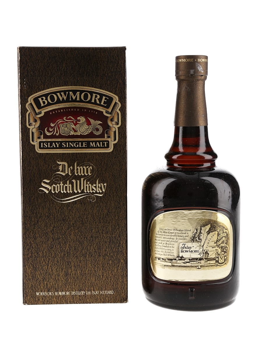 A bottle of Bowmore De Luxe Islay Single Malt Scotch Whisky. We estimate this was bottled in the late 1970s.