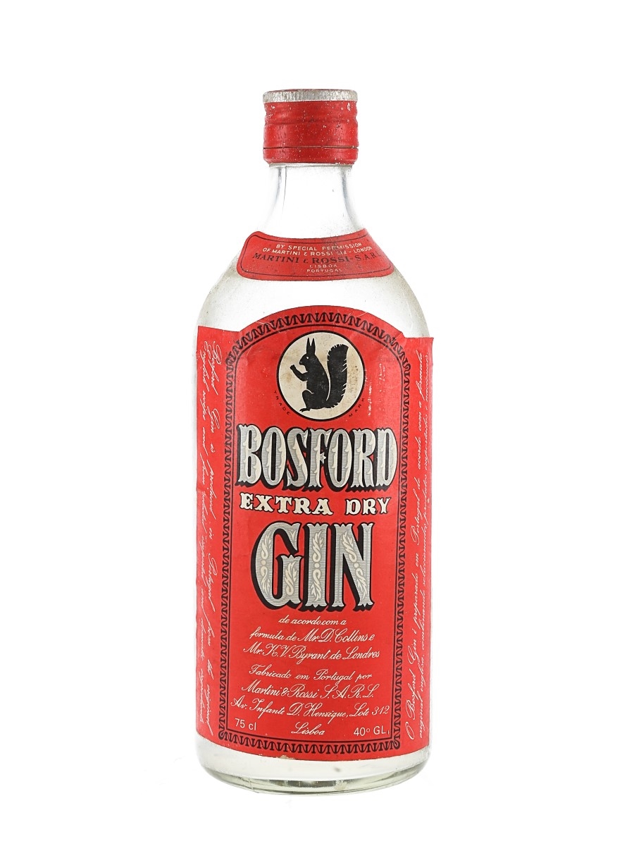 A bottle of Bosford Extra Dry Gin. This was produced in Portugal, by Martini & Rossi according to the formula of Mr D Collins and Mr K V Bryant of London. We estimate this was bottled in the 1980s.