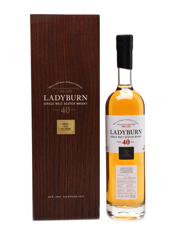 A bottle of Ladyburn 40 Year Old. This was distilled in 1974 and matured in a single first fill bourbon cask before bottling on 25 November 2014. This is presented in a wooden case with the original outer carton.