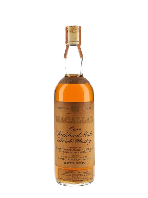 A bottle of The Macallan Single Highland Malt Scotch Whisky. This was distilled in 1950, matured in sherry wood and bottled by Campbell, Hope and King, we estimate in the 1960s. This was imported to Italy by Rinaldi.