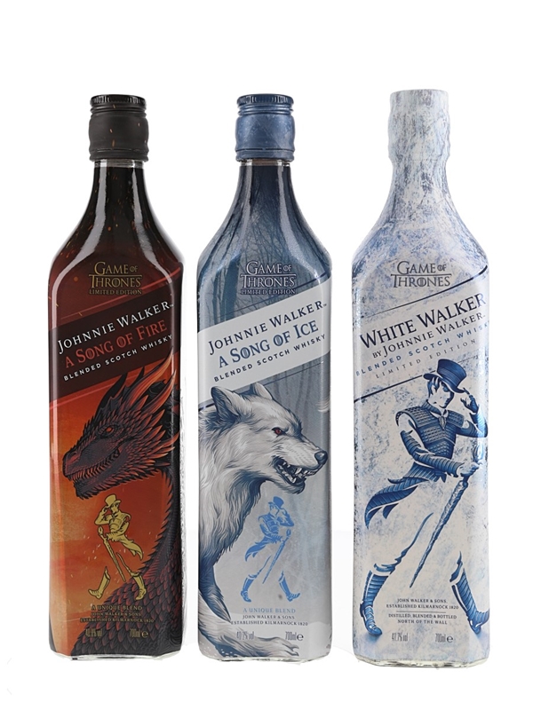 This lot contains three 70cl bottles of Johnnie Walker Game Of Thrones Limited edition Blended Scotch Whiskies, including: A Song of Fire, A Song Of Ice and White Walker. These blends were inspired by the Game of Thrones series.