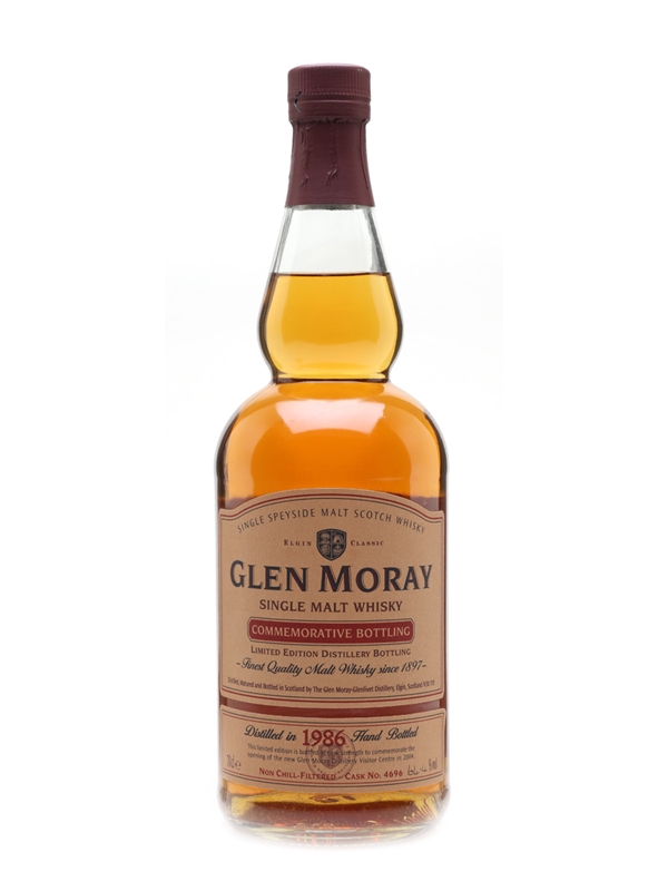 A limited edition bottle of Glen Moray 1986. This was matured for over 17 years in first fill ex-bourbon casks and bottled to celebrate the opening of the distillery's new Visitor Centre in 2004. This release was only available from the distillery.