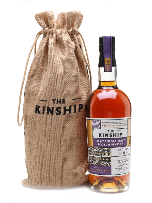 A bottle of Caol Ila 33 Year Old. This is Edition No.3 from Hunter Laing's The Kinship series. This was matured in sherry butts and exclusively released at Feis Ile 2017 to celebrate the commencement of the construction of Ardnahoe Distillery.