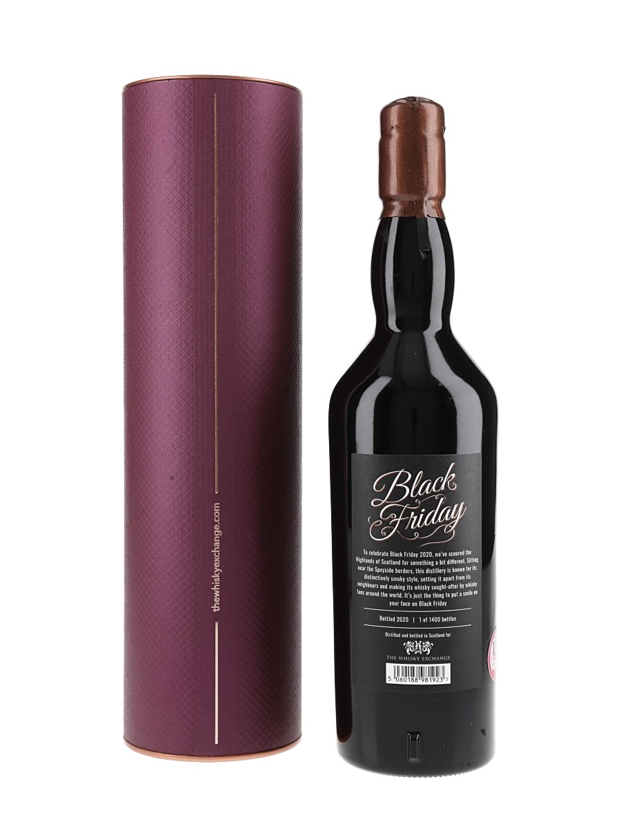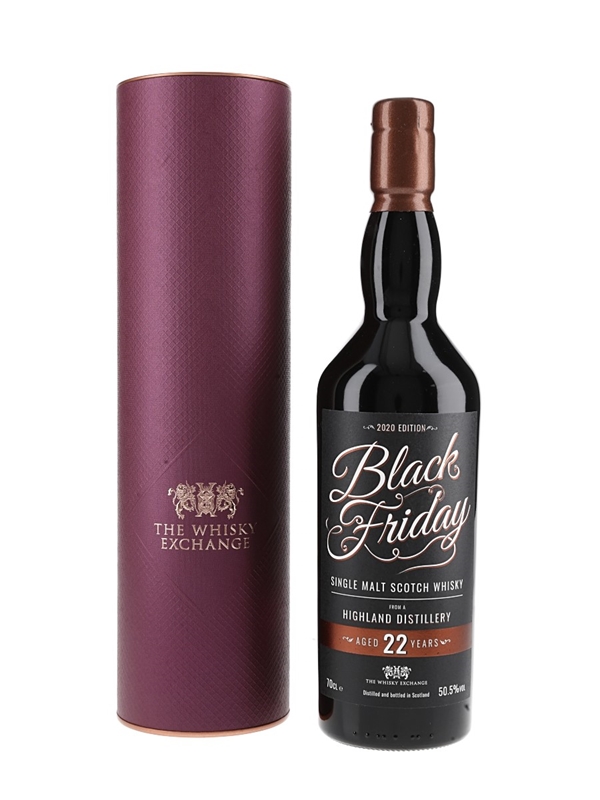 A bottle of Black Friday 22 Year Old Single Malt Scotch Whisky, a single malt Scotch whisky from an undisclosed Highland distillery. This was bottled for The Whisky Exchange to celebrate Black Friday 2020.