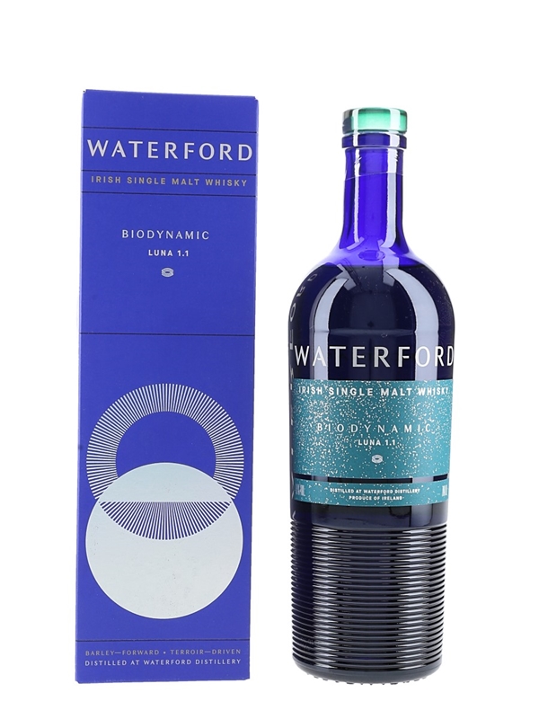A bottle of Waterford Luna 1.1 Biodynamic Irish Single Malt Whisky, the world’s first whisky made from biodynamic barley. The barley for this whisky was harvested in summer 2017.This was distilled in 2018, matured for 3 years, 2 months, 1 day and bottled at 50% ABV on 4 September 2021 as part of the Arcadian Series.