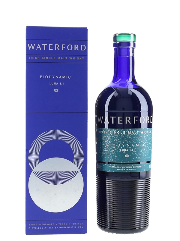 A bottle of Waterford Luna 1.1 Biodynamic Irish Single Malt Whisky, the world’s first whisky made from biodynamic barley. The barley for this whisky was harvested in summer 2017.This was distilled in 2018, matured for 3 years, 2 months, 1 day and bottled at 50% ABV on 4 September 2021 as part of the Arcadian Series.