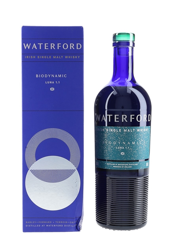 A bottle of Waterford Luna 1.1 Biodynamic Irish Single Malt Whisky, the world’s first whisky made from biodynamic barley. The barley for this whisky was harvested in summer 2017.This was distilled in 2018, matured for 3 years, 2 months, 1 day and bottled at 50% ABV on 4 September 2021 as part of the Arcadian Series.