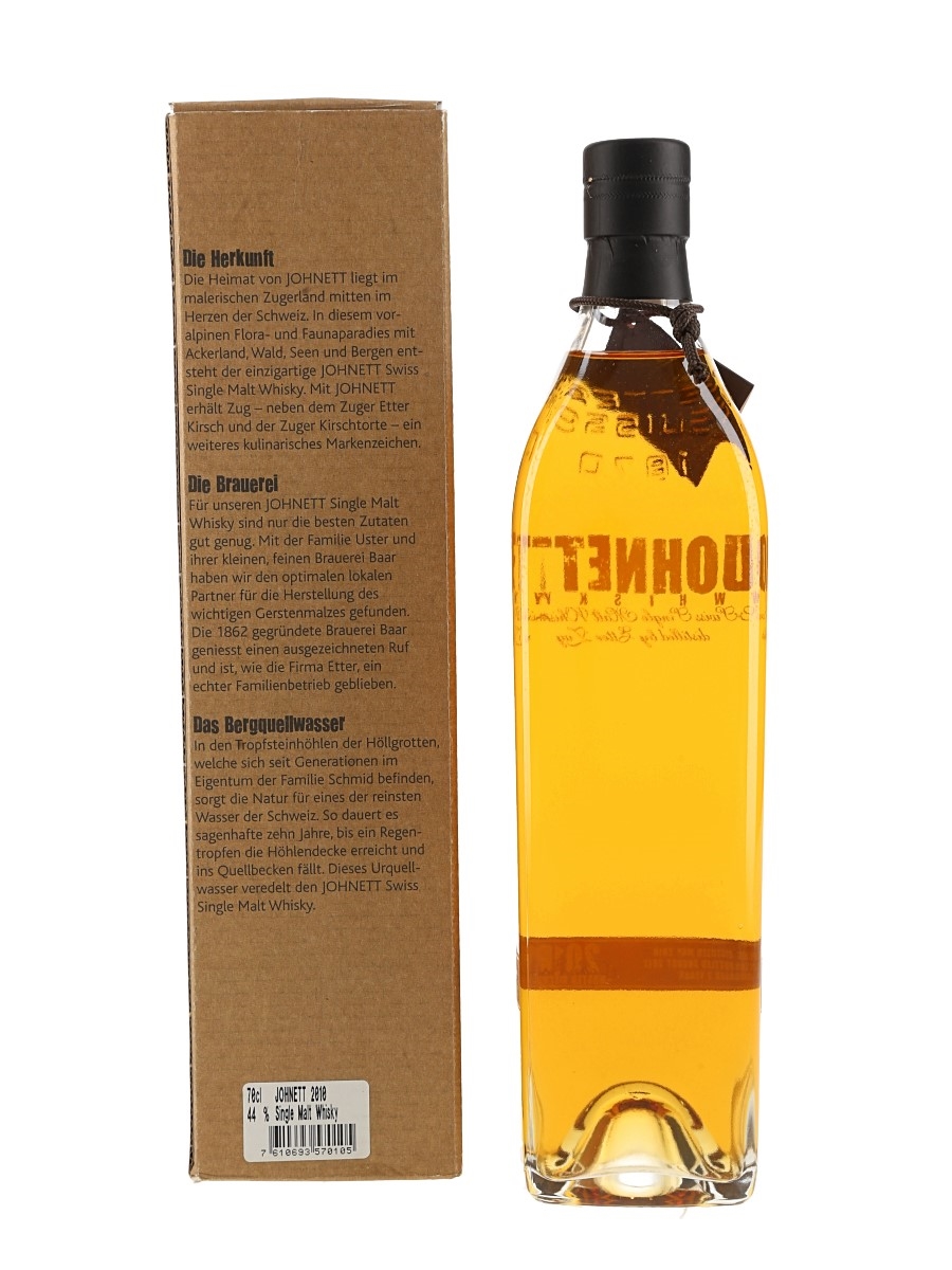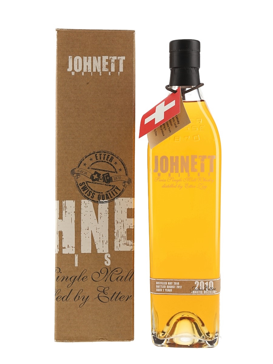 A bottle of Johnett 7 Year Old Swiss Single Malt Whisky. This was distilled in May 2010 and botted in August 2017.