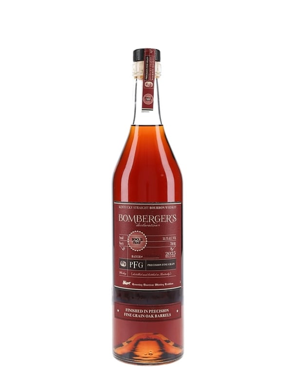 A bottle of Bomberger's Declaration PFG Kentucky Straight Bourbon Whiskey. This was bottled by Michter's Distillery and released in 2025.