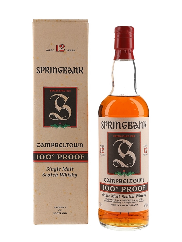 A bottle of Springbank 12 Year Old 100° Proof Campbeltown Single Malt Scotch Whisky. We estimate this was bottled in the 1990s.