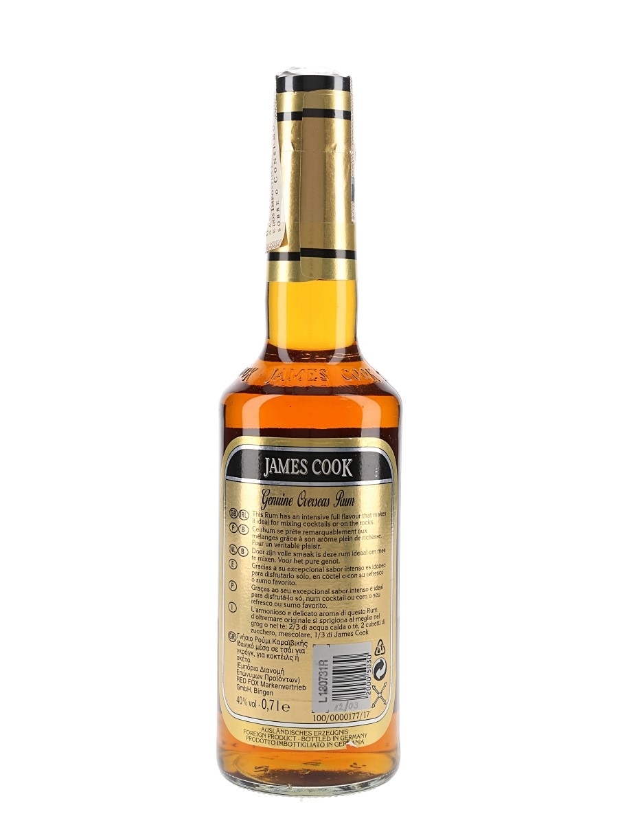 A bottle of James Cook Genuine Overseas Rum bottled in Germany.