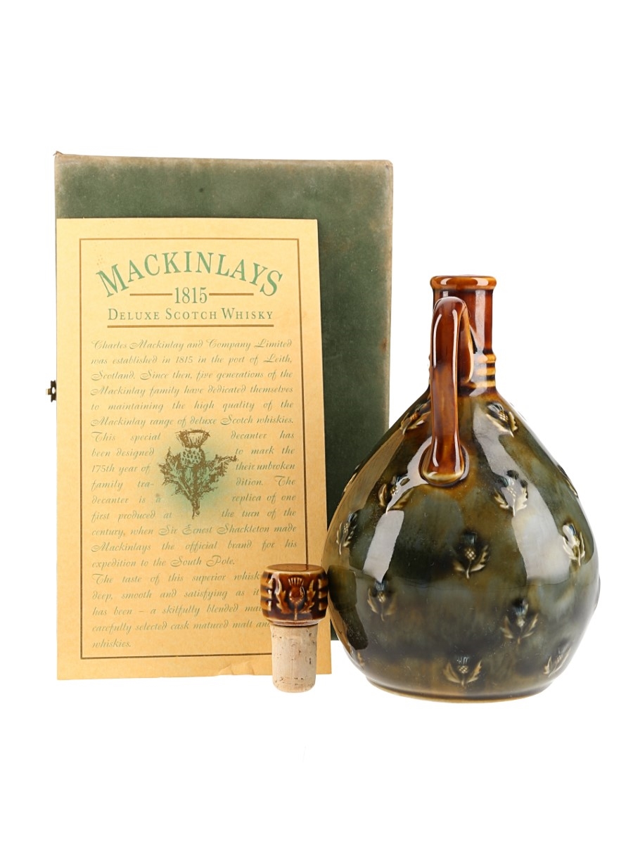 A bottle of Mackinlay's Deluxe 20 Year Old blended whisky, presented in a Wade decanter with stopper. This decanter is a replica of one of the first produced, and was released to celebrate the 175th year of the Mackinlay's tradition.