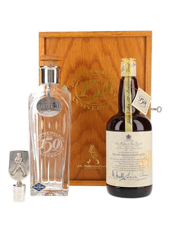 A bottle of Johnnie Walker Blended Scotch Whisky, created to celebrate the company's 150th anniversary in 1970. This bottle comes in a lockable wooden box which includes a crystal decanter and stopper. This was bottled on 11 October 1985.