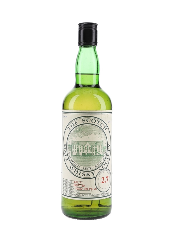 A bottle of Glenlivet Single Malt Scotch Whisky from Scotch Malt Whisky Society. This was distilled in April 1971 and bottled in September 1989 at 59.1 % ABV.