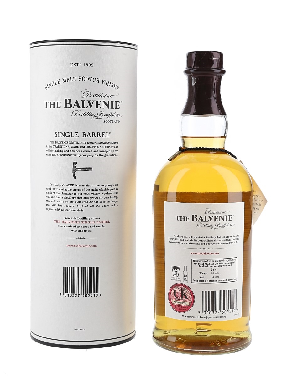 A bottle of Balvenie 15 Year Old Single Barrel Single Malt Scotch Whisky. This was distilled on 28 September 1998, matured in a single barrel and bottled on 22 January 2014.