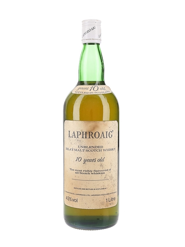 A bottle of Laphroaig 10 Year Old Single Islay Malt Scotch Whisky. We estimate this was bottled in the early 1980s, before the distillery was awarded its royal warrant.