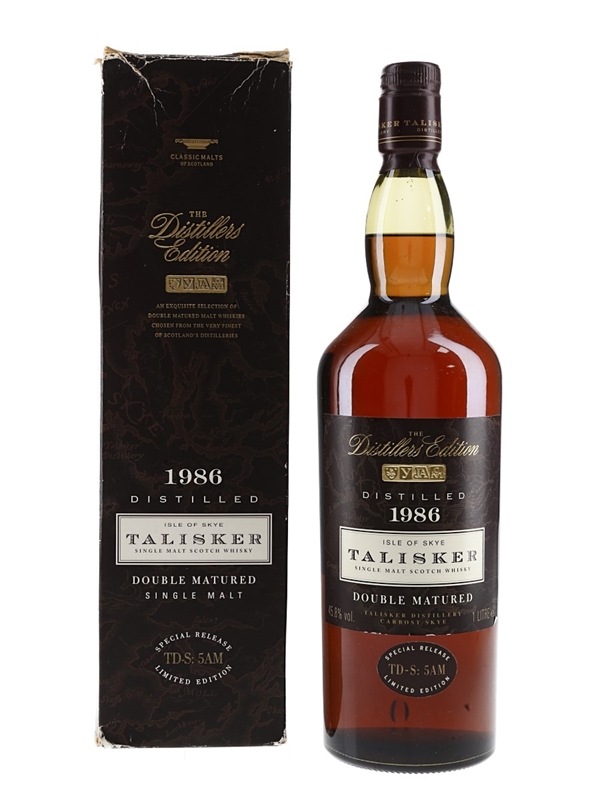 A litre bottle of Talisker Single Malt Scotch Whisky. This was distilled in 1986, double matured in Amoroso sherry casks and bottled at 45.8% ABV for the Distillers Edition range.