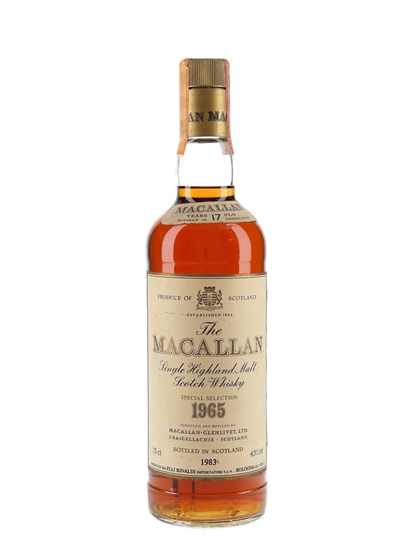 A bottle of The Macallan 17 Year Old Single Highland Malt Scotch Whisky. This was distilled in 1965, matured in sherry casks and bottled in 1983 at 43% ABV. This was imported to the Italian market by Rinaldi.