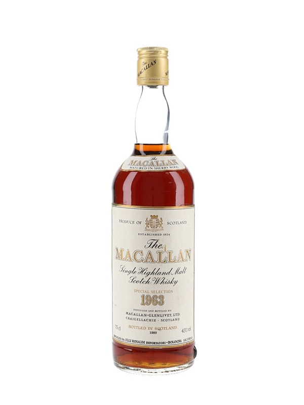 A bottle of The Macallan 1963 Special Selection Single Highland Malt Scotch Whisky, bottled for Italian importer Rinaldi in 1980.