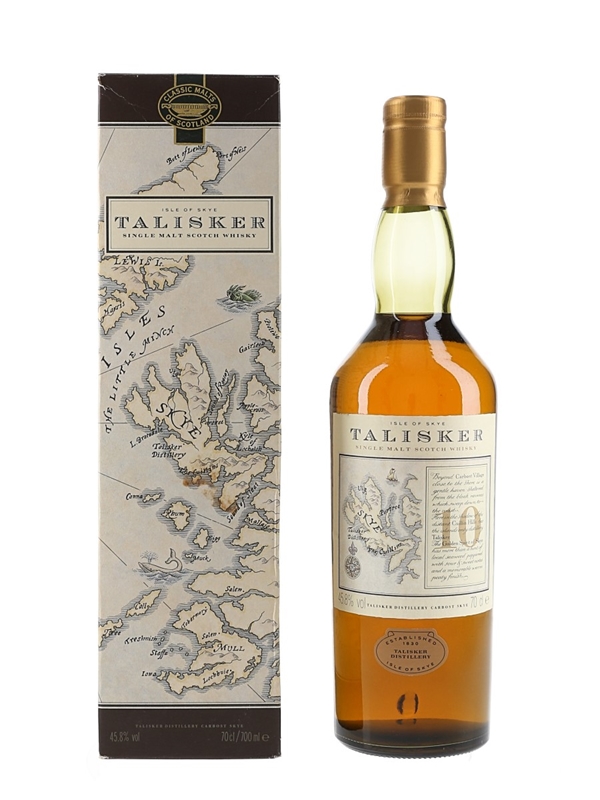 A bottle of Talisker 10 Year Old Single Malt Scotch Whisky with the label featuring a map of the Isle of Skye. We estimate this was bottled in the 1990s.
