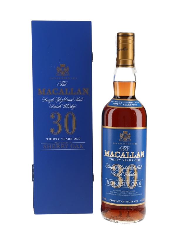 A bottle of The Macallan 30 Year Old Single Highland Malt Scotch Whisky, matured in sherry casks. This was the last edition of the 30 year old to be released before the introduction of the Fine Oak series.