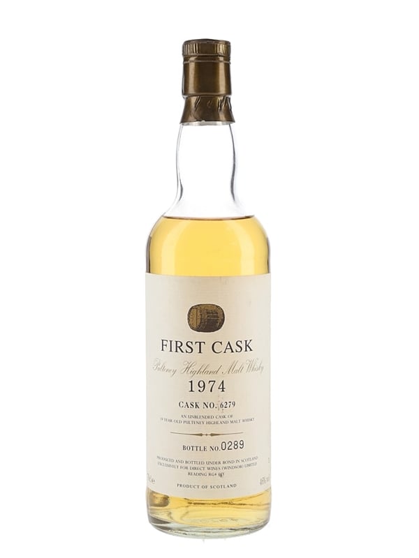 A bottle of Pulteney 19 Year Old Single Malt Scotch Whisky. This was distilled in 1974, matured in a single cask and bottled by Direct Wines Ltd. As part of the First Cask series, available exclusively to First Cask Circle Members.