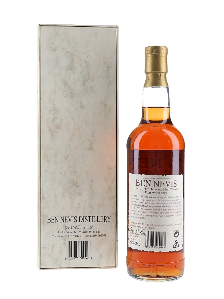 A bottle of Ben Nevis 13 Year Old Highland Single Malt Scotch Whisky. This was distilled in 1990, finished in a port wood cask and bottled at 61.6% ABV in 2004.