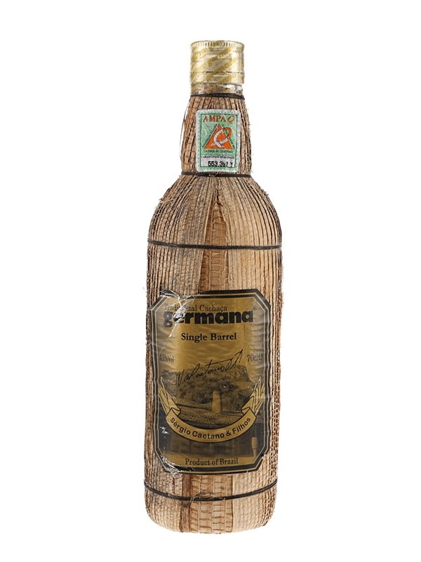 A bottle of Sergio Caetano & Filhos Germana Cachaca Ultra Premium aged for one year in French oak barrels, produced and bottled by Uniagro.