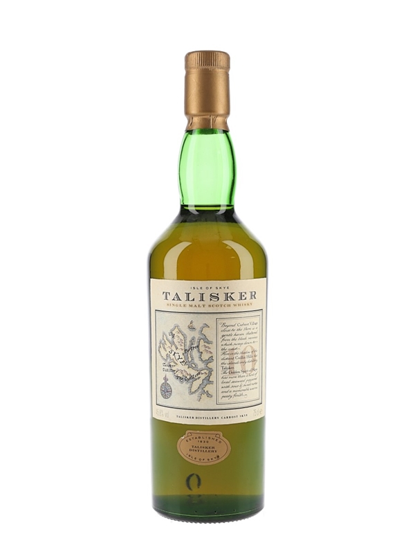 A bottle of Talisker 10 Year Old Single Malt Scotch Whisky with the label featuring a map of the Isle of Skye. We estimate this was bottled in the 1980s.