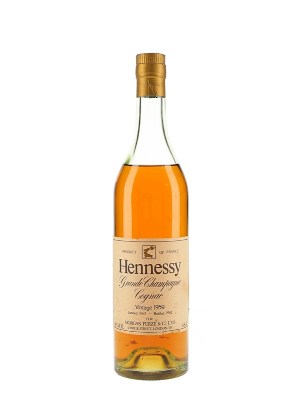 A bottle of 1959 Hennessy Vintage Grande Champagne Cognac. This landed in the UK in 1963 and was bottled in 1982 for Morgan Furze & Co. Ltd.