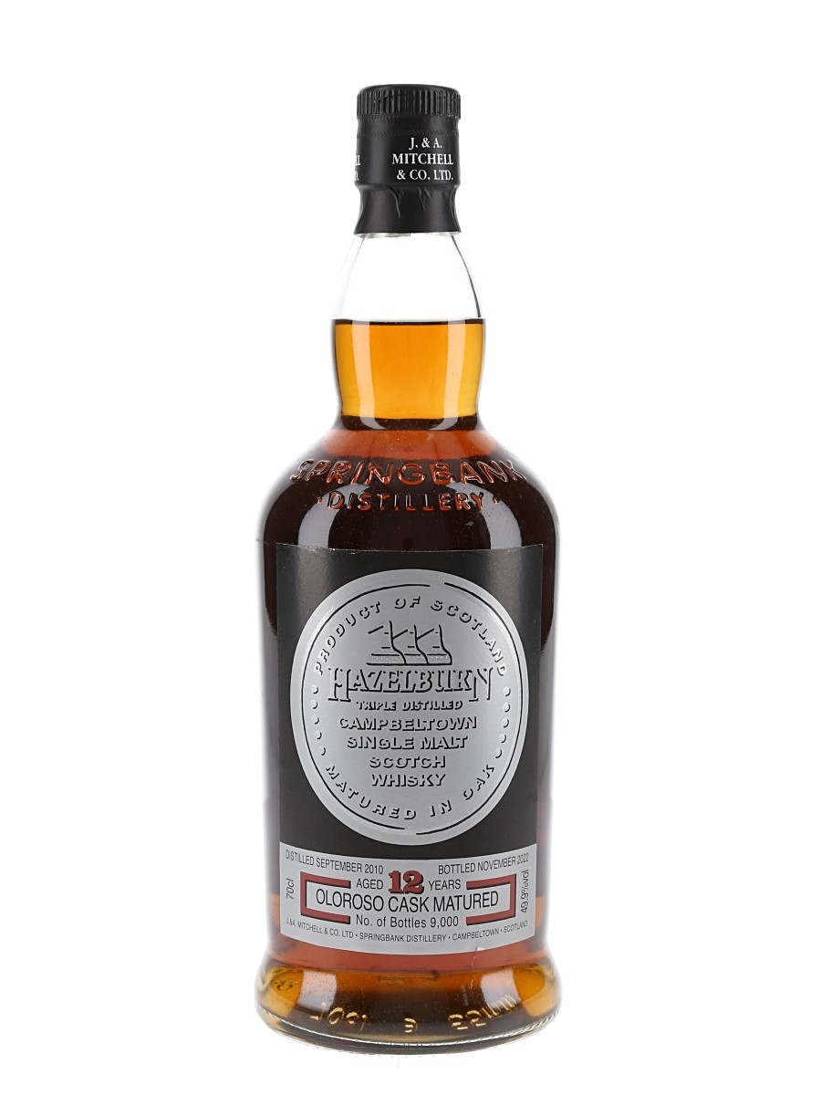 A bottle Hazelburn 12 Year Old Campbeltown Single Malt Scotch Whisky. This was triple distilled in September 2010 at Springbank distillery, matured in fresh oloroso sherry casks and bottled in November 2022. This is one of 9000 bottles.