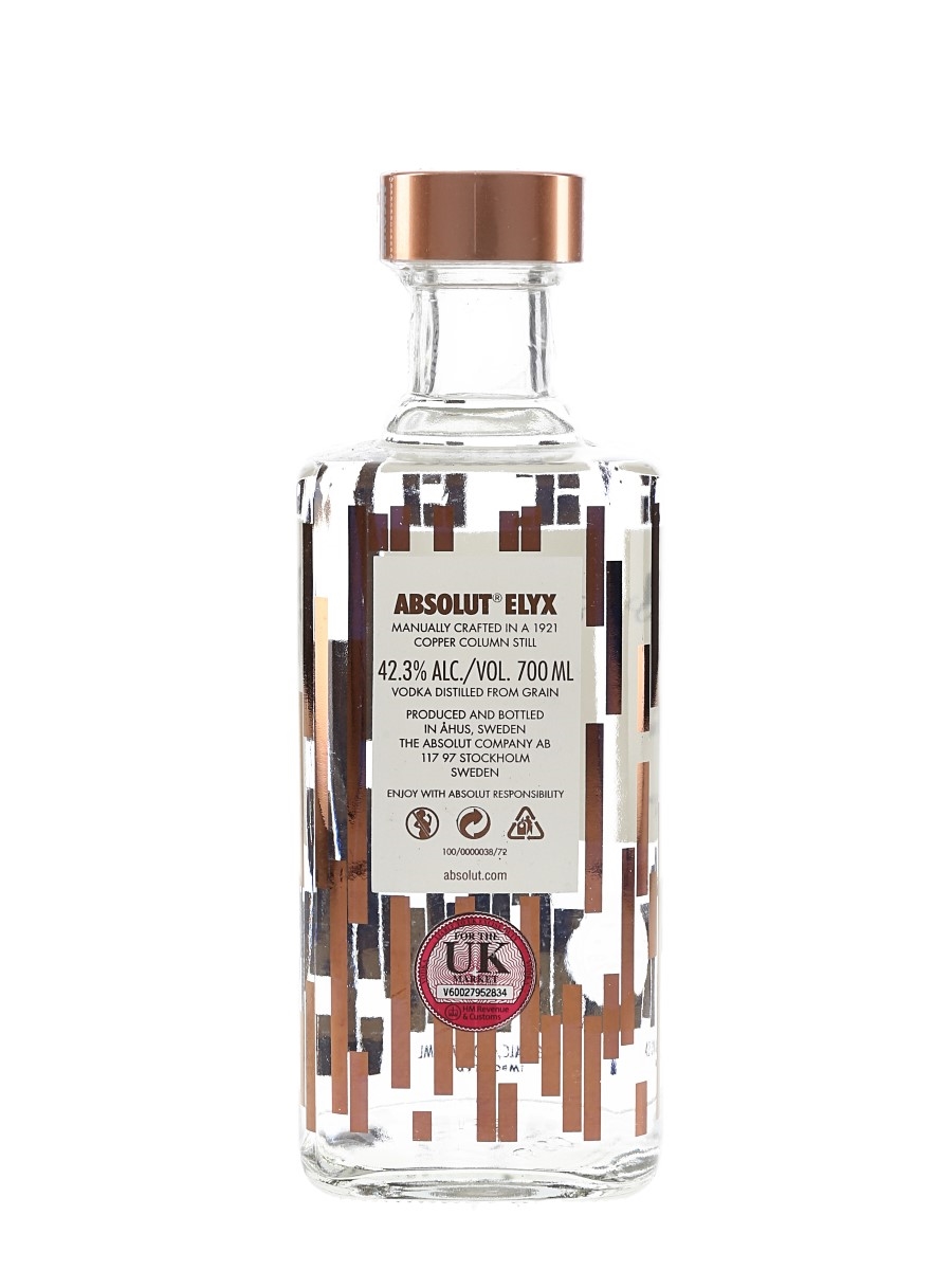 A bottle of Absolut Elyx Single Estate Handcrafted Vodka from Sweden. This was distilled from locally grown wheat in a copper column still that dates from 1921.