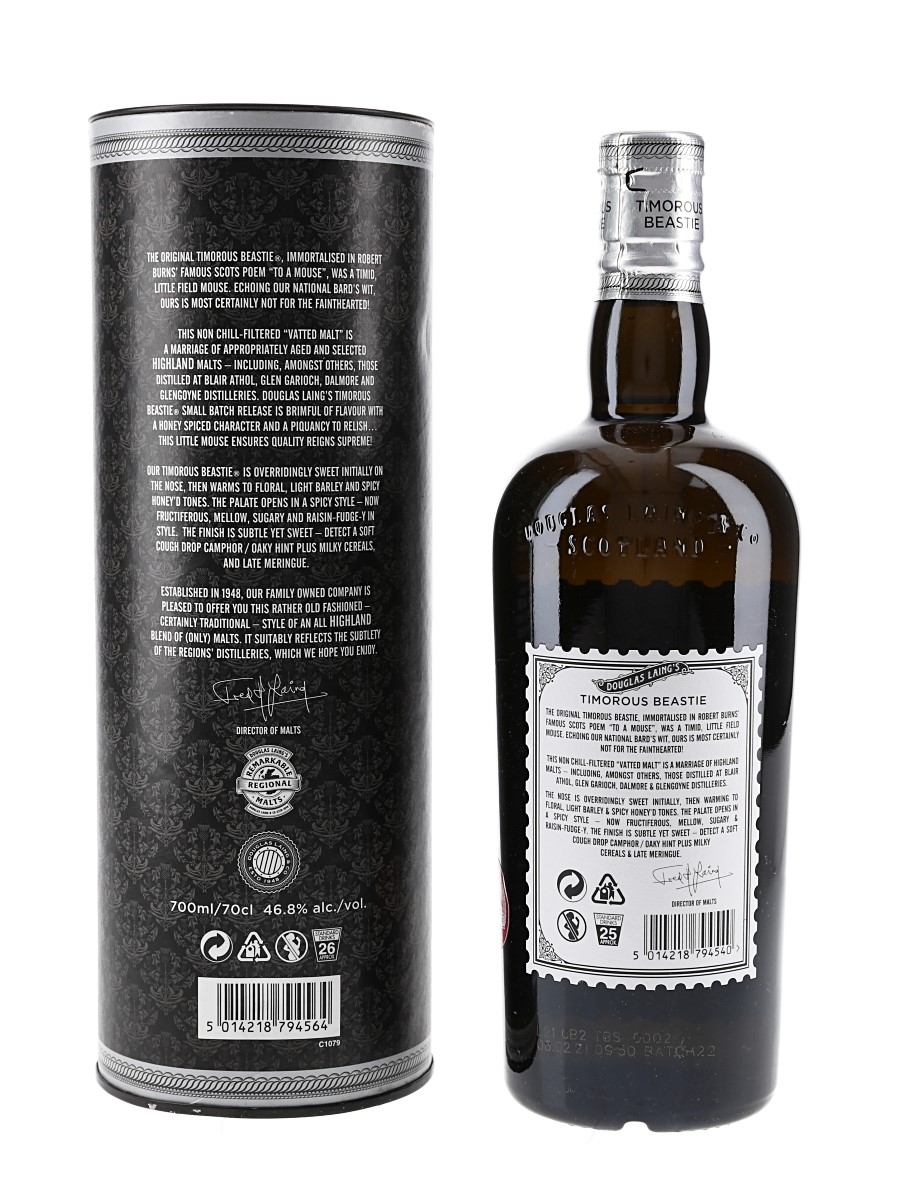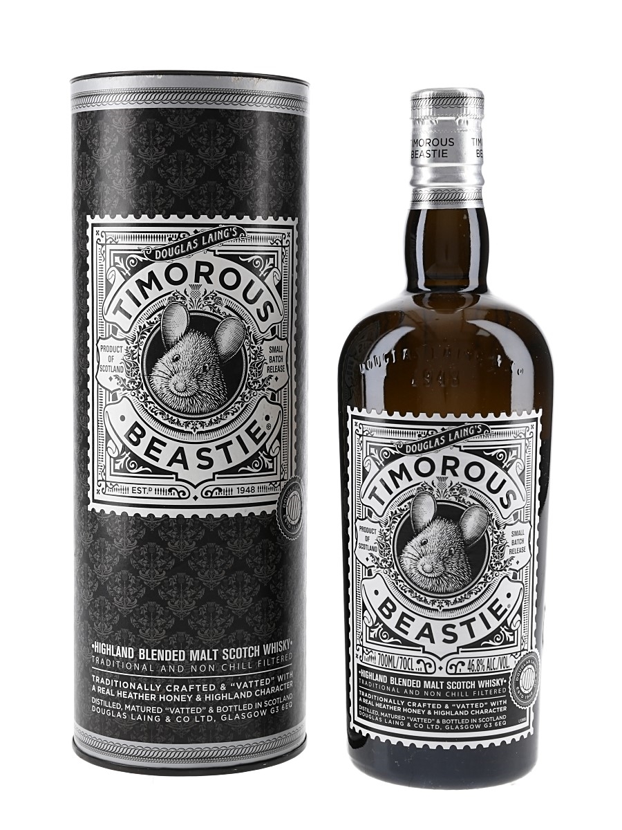 A bottle of Timorous Beastie Highland Blended Malt Scotch Whisky, bottled at 46.8% ABV by Douglas Laing.