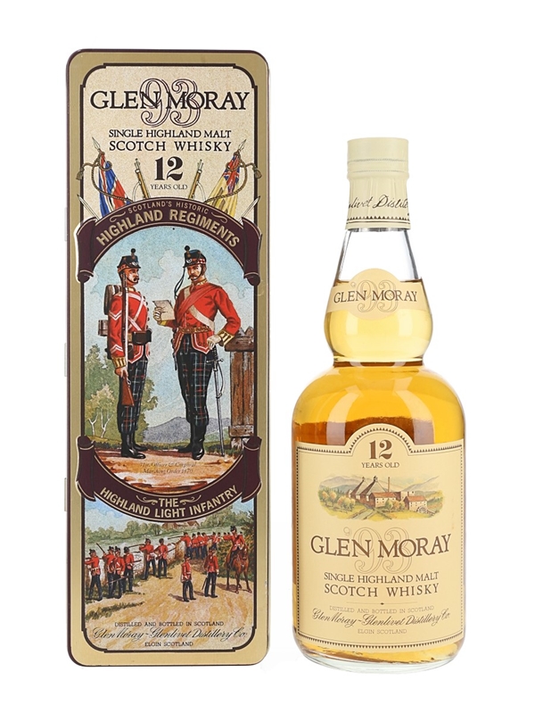 A bottle of Glen Moray 12 Year Old Single Highland Malt Scotch Whisky in a Scotland's Historic Highland Regiments tin. This tin depicts The Highland Light Infantry. We estimate this was bottled in the 1980s.