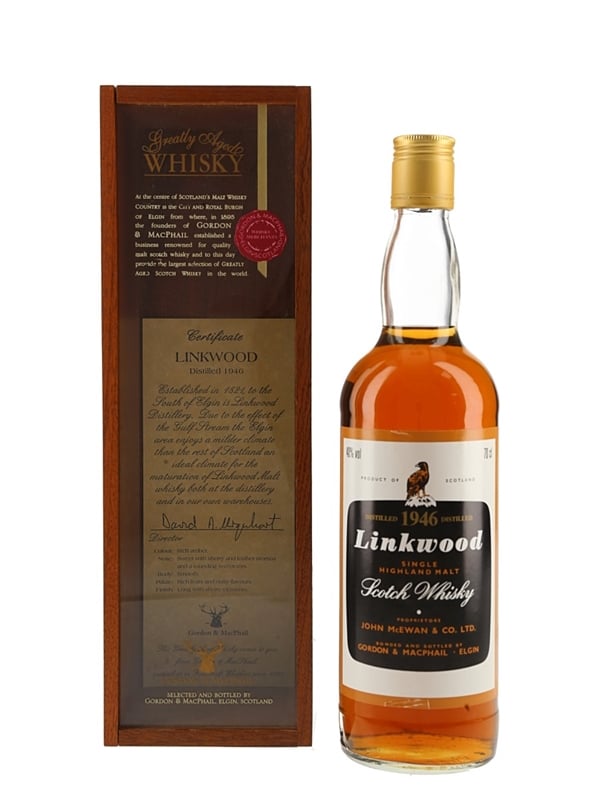 A bottle of Linkwood 1946 single malt Scotch whisky. This was bottled by Gordon & MacPhail. The bottling code indicates this was bottled in 1992.