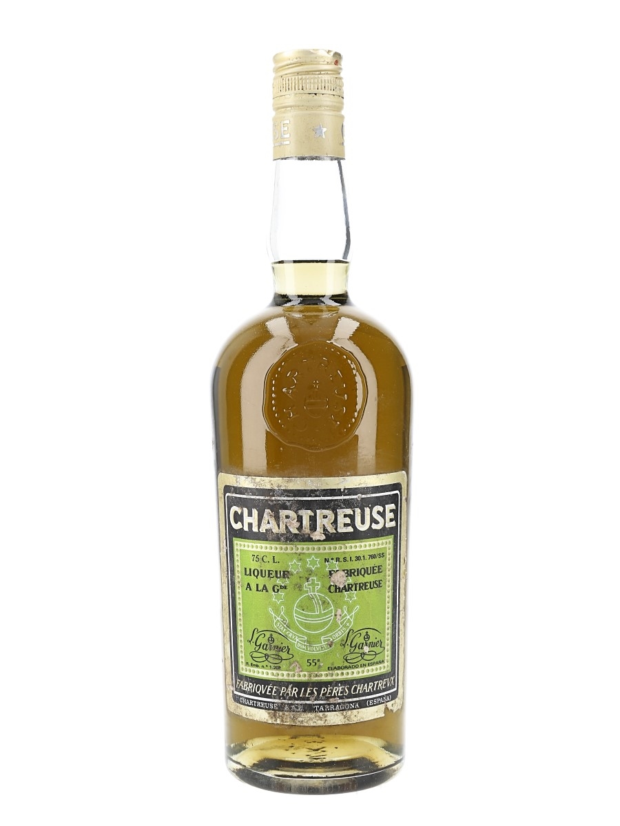 A bottle of Chartreuse Green liqueur produced in Tarragona, Spain. We estimate this was bottled between 1973 to 1985.