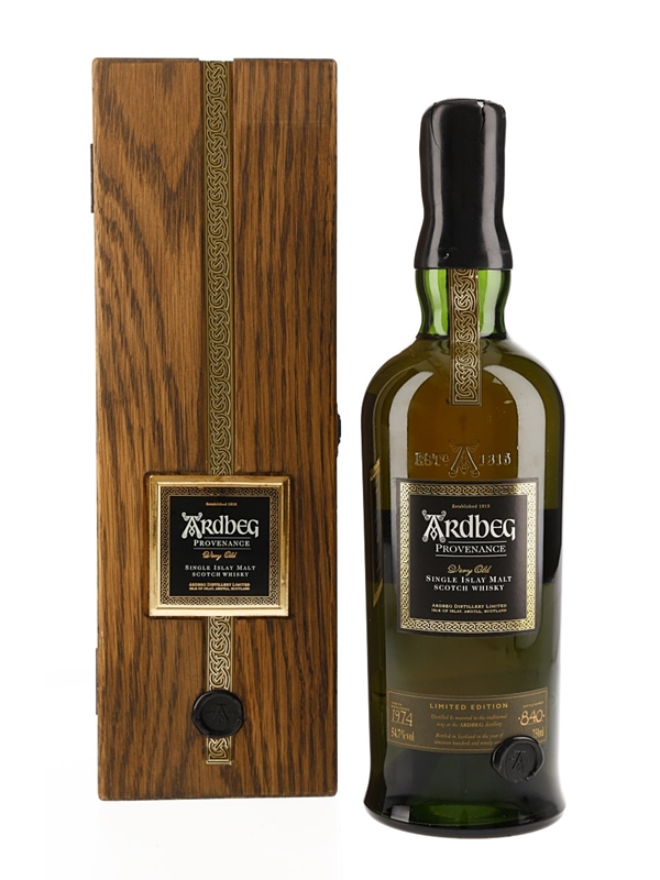 A bottle of Ardbeg Provenance Very Old Single Islay Malt Scotch Whisky. This was distilled in 1974, one of the last years that Ardbeg's maltings were fully operational, and bottled in 1998 at a cask strength of 54.7% ABV.