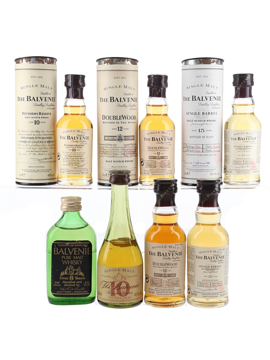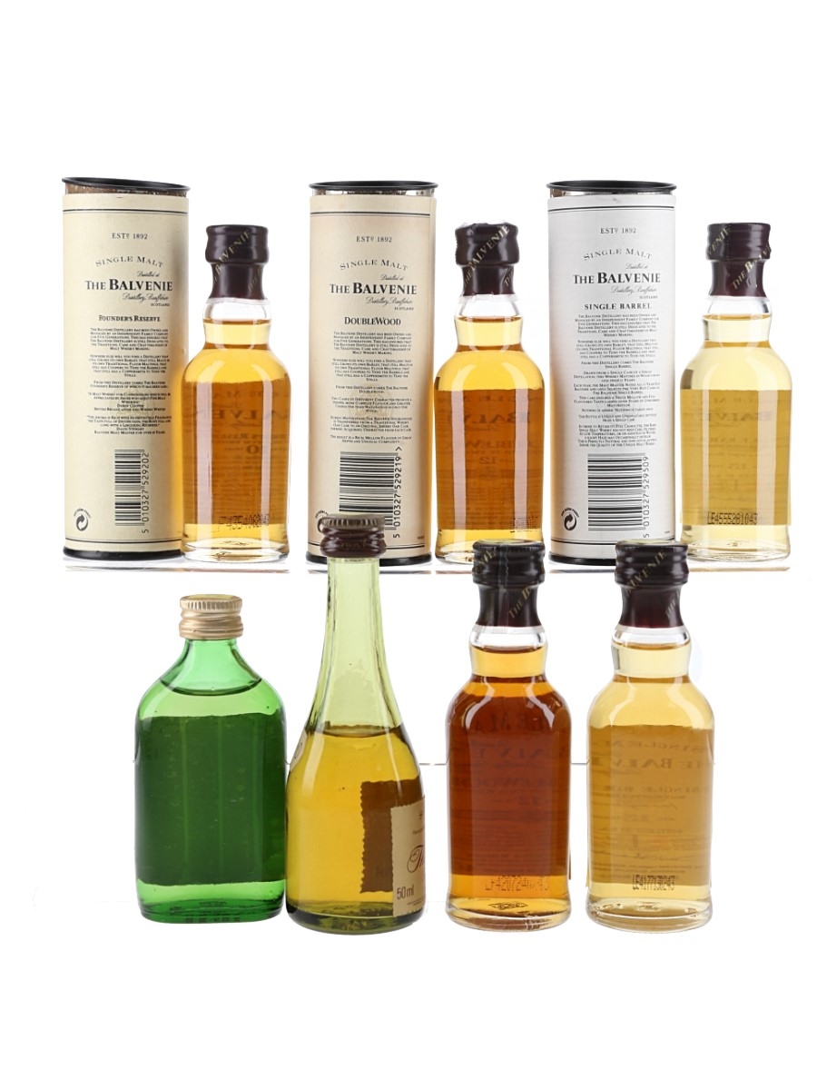 This lot contains seven miniature bottles of Balvenie Single Malt Scotch Whisky including: