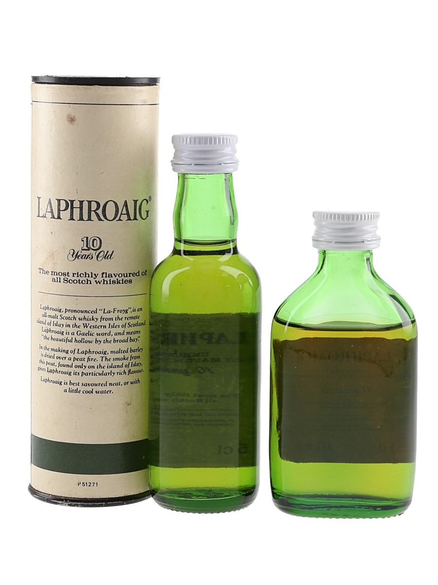This lot contains two miniature bottles of Laphroaig 10 Year Old Unblended Islay Malt Scotch Whisky distilled and bottled by D. Johnston & Co.