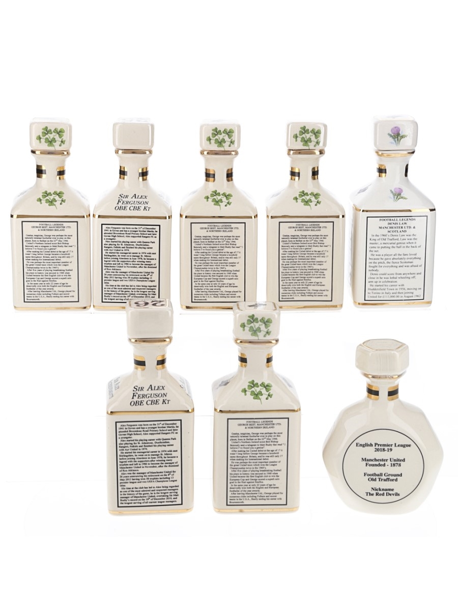 This lot contains eight Manchester United ceramic decanters from the Pointers of London & Edinburgh.