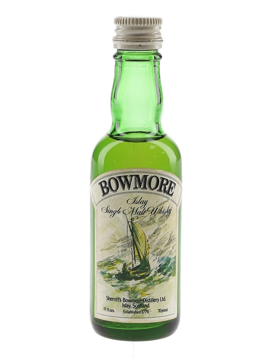 A miniature bottle of Bowmore Islay Single Malt Whisky bottled by Sherriff's Bowmore Distillery Ltd. We estimate this was bottled in the 1970s.
