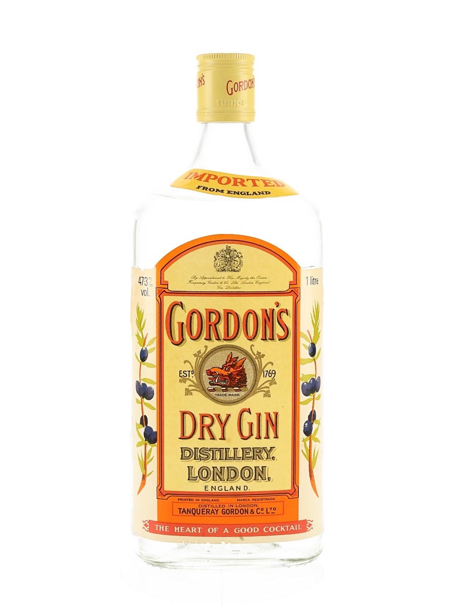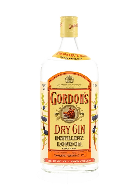 A litre bottle of Gordon's Dry Gin, bottled at the higher strength of 47.3% ABV, we estimate in the 1980s.