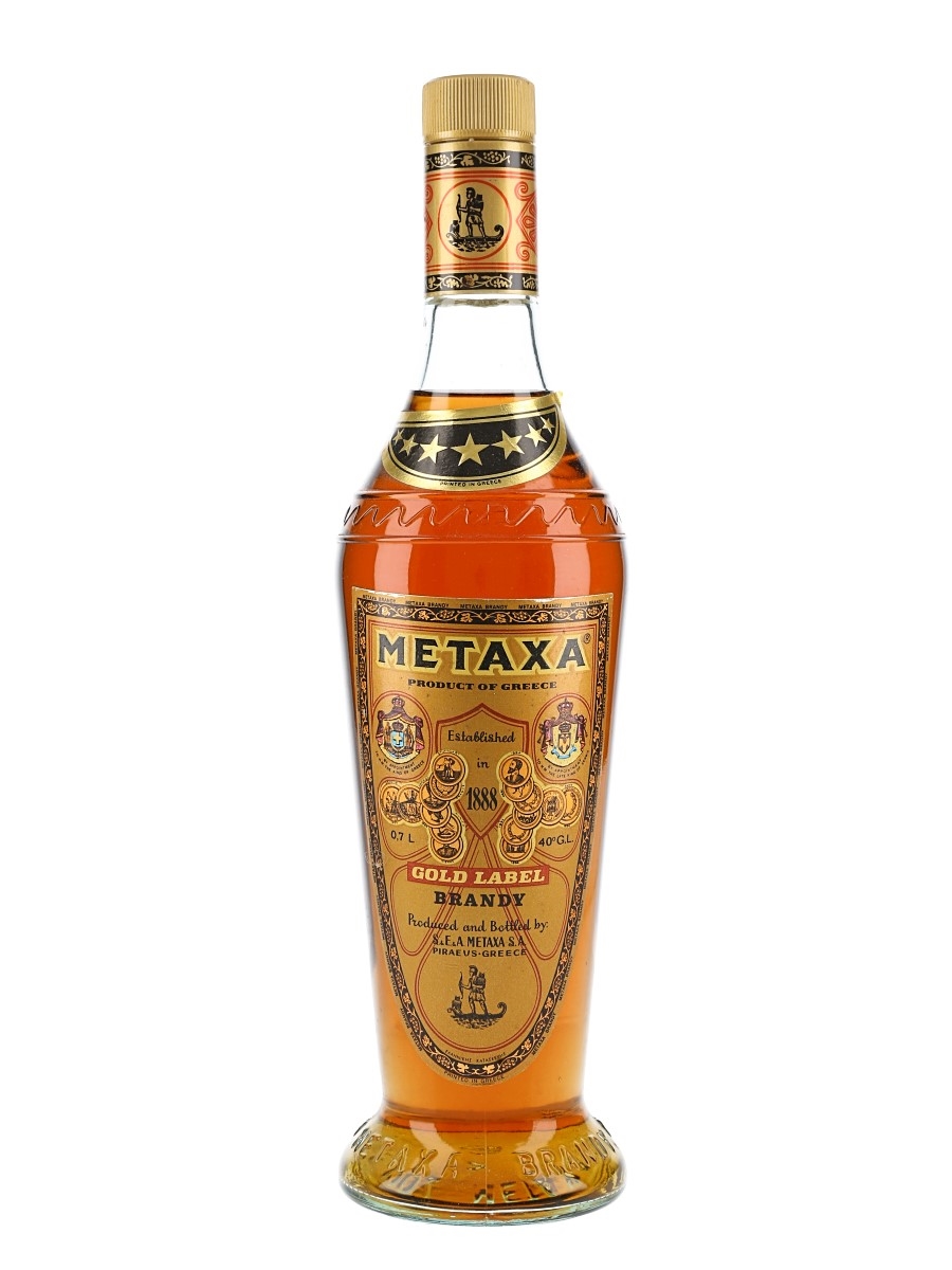 A bottle of Metaxa 7 Star Gold label brandy from Greece.