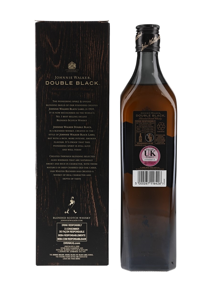 A bottle of Johnnie Walker Double Black blended Scotch whisky, a smokier take on the standard Black Label.