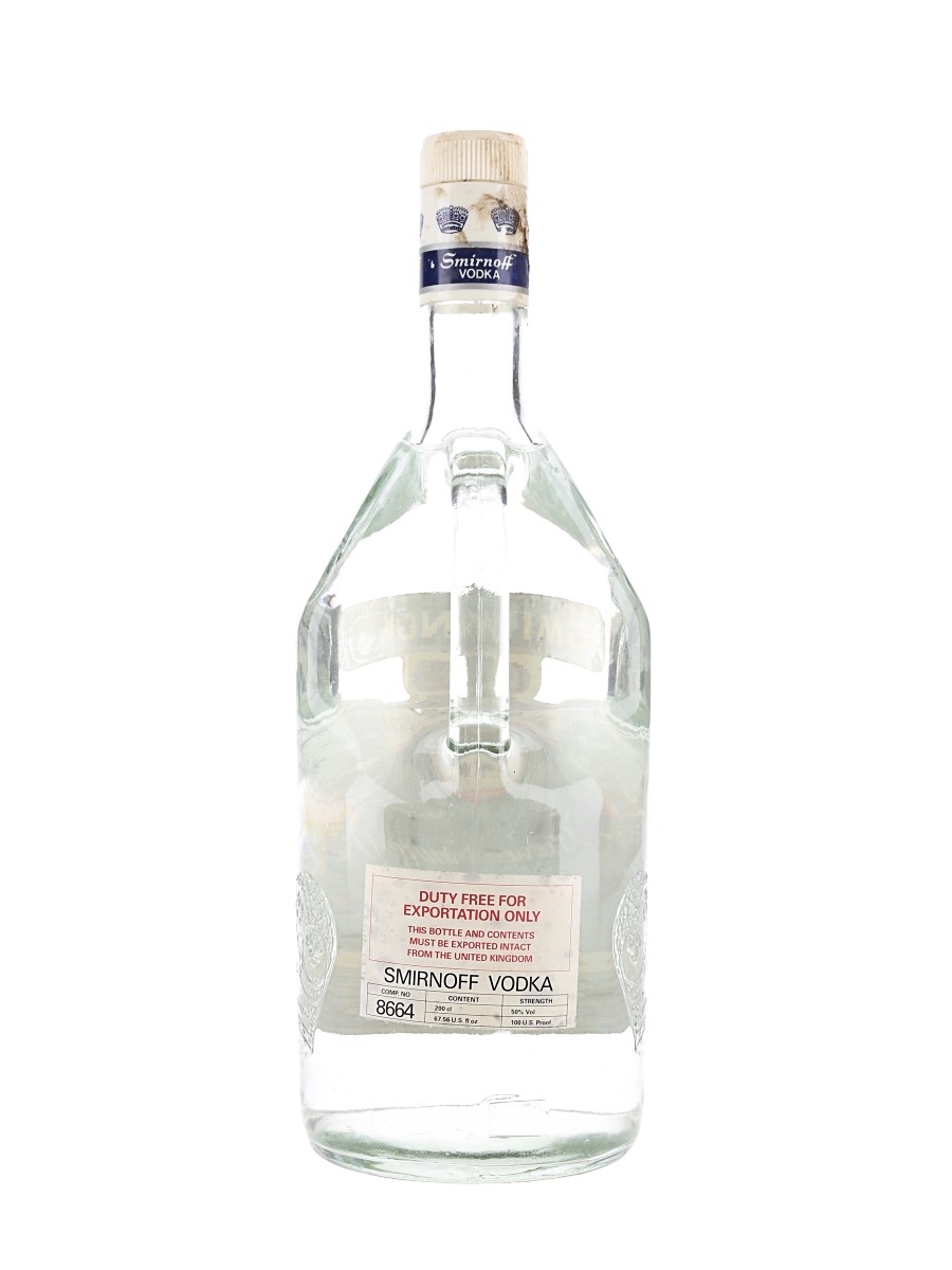 A 200cl large format bottle of Smirnoff Blue Label Vodka with a pouring handle, produced in the United Kingdom and bottled at 50% ABV, we estimate in the 1980s.