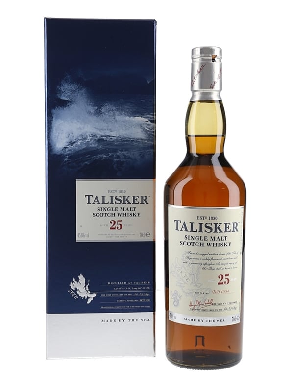 A bottle of Talisker 25 Year Old Single Malt Scotch Whisky, the island representative in Diageo's Classic Malts of Scotland range.