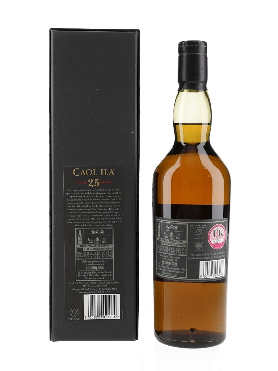 A bottle of Caol Ila 25 Year Old Islay Single Malt Scotch Whisky. Introduced in 2010, after cask strength versions in 2004 and 2005, this is the first officially-bottled Caol Ila 25 Year Old to be bottled at 43% ABV.